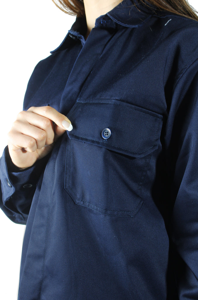 Su diseño ergonómico y profesional incluye dobladillos reforzados, cuello estructurado, puños con botones y aletilla cubrebotón oculta, ideal para uniformes corporativos o actividades operativas donde la presentación es clave.