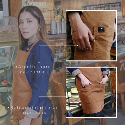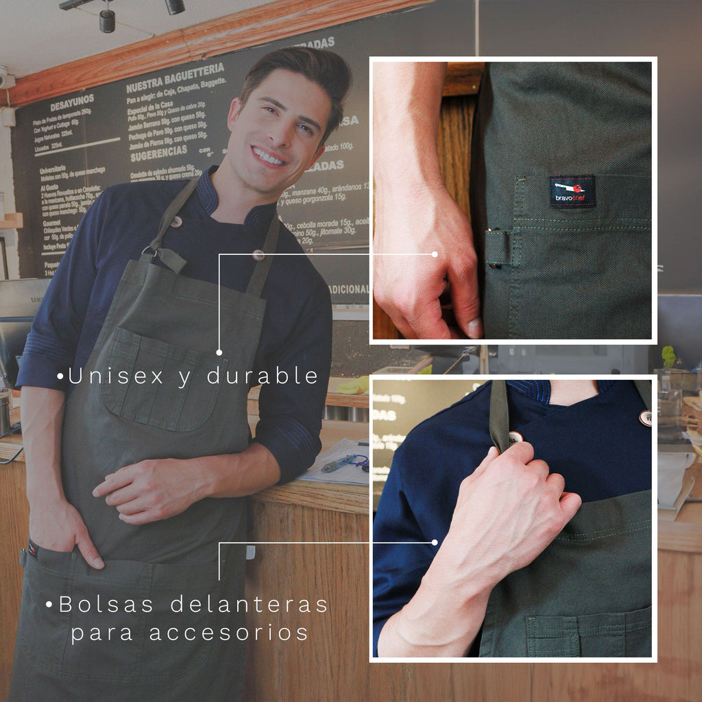 Respecto a su diseño, este es muy cómodo y práctico, ya que cuenta con dos bolsas ubicadas en parte superior e inferior para obtener mayor dinamismo a la hora de elaborar alimentos o simplemente para atender al persona e tu negocio.
